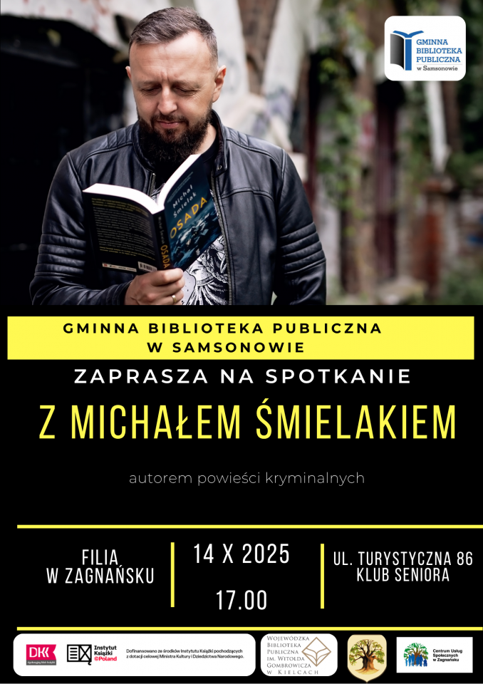 Gminna Biblioteka Publiczna w Samsonowie serdecznie zaprasza do Klubu Seniora w Zagnańsku na wyjątkowe spotkanie z Michałem Śmielakiem – autorem pasjonujących powieści sensacyjnych i kryminalnych rodem z Sandomierza.